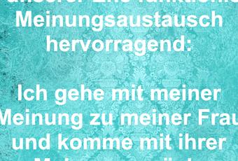 Auf Facebook teilen Vorige Folgende In unserer Ehe funktioniert Meinungsaustausch... Autor des Artikels : istdaslustig Zum Original-Artikel In unserer Ehe funktioniert Meinungsaustausch hervorragend: Ich gehe mit meiner Meinung zu meiner Frau und komme mit ihrer Meinung zurück. Hier geht es zum Artikel Mehr Lustiges auf www.istdaslustig.de Auf Facebook teilen Vorige Folgende Das könnte Ihnen gefallen Mehr