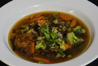 Den Reis im Salzwasser al dente kochen, er darf ruhig noch etwas viel Biss haben, da er in der Suppe noch wenige Minuten zieht. Die Karotten schälen und in mundgerechte Stücke schneiden. Den Brokkoli in kleine Röschen teilen. Die gekochten Mu err Pilze in Streifen schneiden.Den Knoblauch schälen und hacken.Die Schalotte schälen, halbieren und in schmale Streifen, die Frühlingszwiebel in Ringe schneiden. In einem Topf/ Wok, das Öl erhitzen geriebenen Ingwer, Knoblauch, die Karotte sowie Schalotte anschwitzen. Pilze und Brokkoli dazugeben. Mit Gemüsefond ablöschen, den Reis dazugeben.