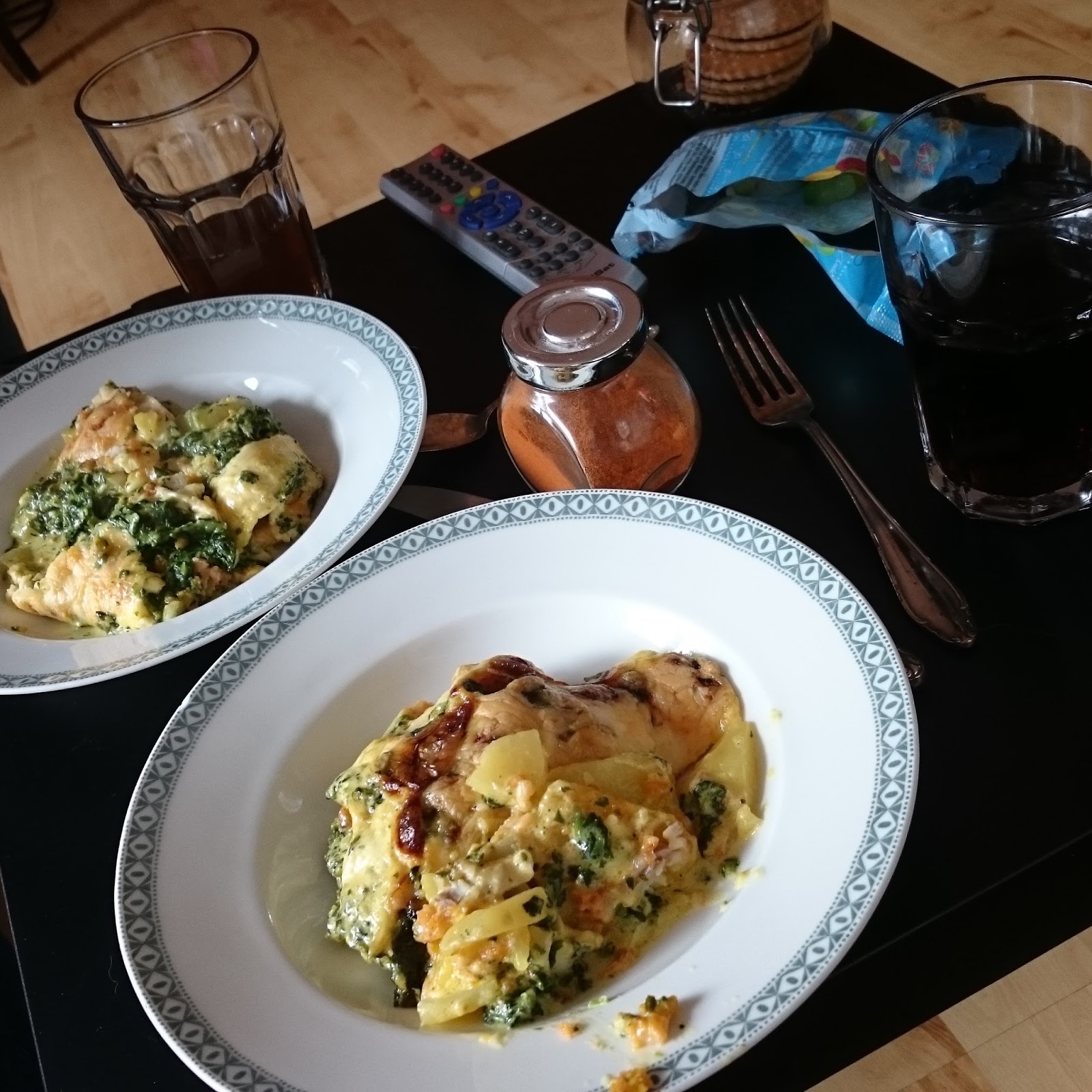 Jenny hat letzte Woche Fischstäbchenauflauf mit Kartoffeln und Spinat gemacht, das war sehr lecker! :)Montag