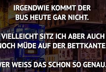 Auf Facebook teilen Vorige Folgende IRGENDWIE KOMMT DER BUS HEUTE GAR NICHT.... Autor des Artikels : istdaslustig Zum Original-Artikel IRGENDWIE KOMMT DER BUS HEUTE GAR NICHT. VIELLEICHT SITZ ICH ABER AUCH NOCH MÜDE AUF DER BETTKANTE. WER WEISS DAS SCHON SO GENAU... Hier geht es zum Artikel Mehr Lustiges auf www.istdaslustig.de Auf Facebook teilen Vorige Folgende Das könnte Ihnen gefallen Mehr