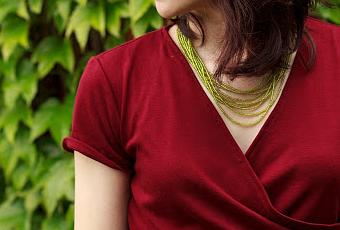 Da ich beim Schnittauflegen immer sehr sparsam mit dem Stoff umgehe, blieb von dem Stoff für das Raglankleid einiges übrig. Ich suchte noch am gleichen Nachmittag auf Pinterest nach Inspirationen, was ich mit dem dunkelroten Jerseystoff anfangen könnte. Geworden ist es dann ein Top in Wickeloptik.