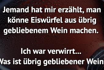 Auf Facebook teilen Vorige Folgende Jemand hat mir erzählt, man könne Eiswürfel aus... Autor des Artikels : istdaslustig Zum Original-Artikel Jemand hat mir erzählt, man könne Eiswürfel aus übrig gebliebenem Wein machen. Ich war verwirrt... Was ist übrig gebliebener Wein? Hier geht es zum Artikel Mehr Lustiges auf www.istdaslustig.de Auf Facebook teilen Vorige Folgende Das könnte Ihnen gefallen Mehr