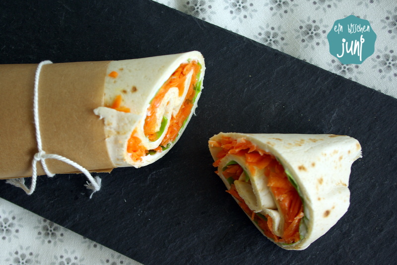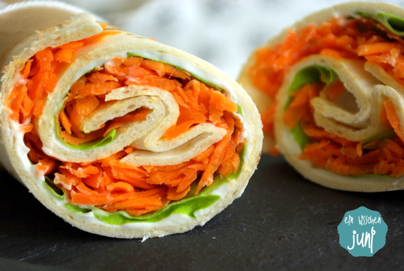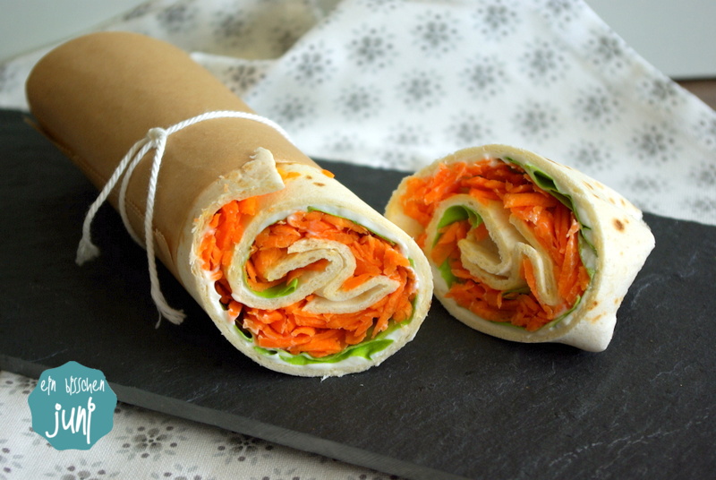 Den Backofen auf 180° vorheizen. Die Karotten schälen und raspeln. Die Salatblätter waschen und trockenschütteln. Die Wraps kurz (1 - 2 Minuten) in den Backofen geben (wenn sie angewärmt sind, lassen sie sich leichter rollen). Die Wraps aus dem Ofen holen und dann auf jedem Wrap etwas Frischkäse verstreichen; etwas salzen und pfeffern. Darauf kommen die Salatblätter und dann die geraspelten Karotten. Alles nochmal etwas mit Salz und Pfeffer würzen. Dann jeden Wrap unten und oben einschlagen und seitlich zusammenrollen. Damit die Wraps gut zusammenhalten, wickle ich sie fest in Alufolie ein. So überstehen sie auch den Transport in der Handtasche ohne Probleme!