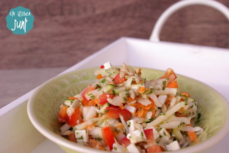 Zutaten: Für den Salat:2 kleine Kohlrabi1 große Karotte1/2 Zucchini1 rote Paprika100 g SchafskäseSonnenblumenkerne