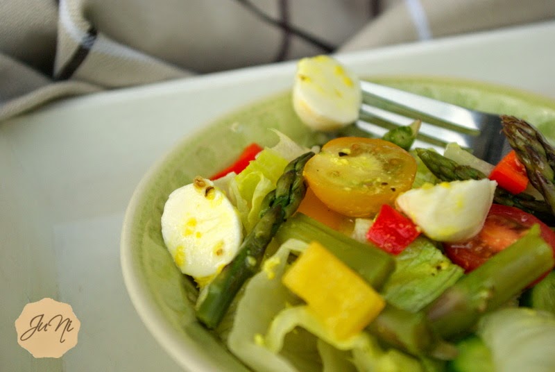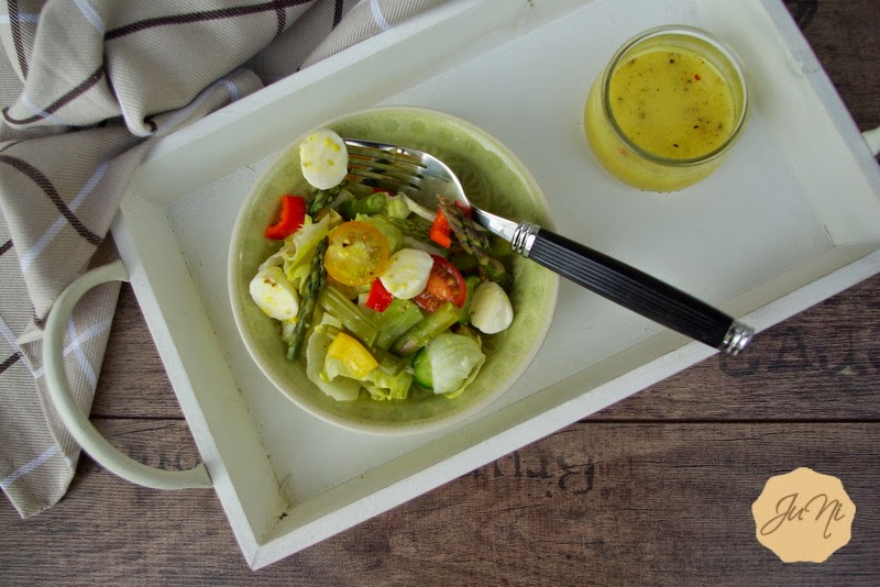 Heute gibt es einen ganz simplen Spargel-Salat mit einem Honig-Senf-Dressing!Zutaten für 2 gute Portionen