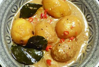 Öl in einem Topf erhitzen und die Gewürzpaste darin anbraten. Kokosmilch angießen, Zitronengras, Ingwer, Galagant und Kaffirlimettenblätter zugeben und aufkochen. Die Sauce mit Salz abschmecken und die Kartoffeln (nach Geschmack geschält oder ungeschält) zugeben. Deckel auflegen und bei geringer Hitze noch ca. 10 min weitergaren. Nochmals mit Salz abschmecken und gleich servieren.