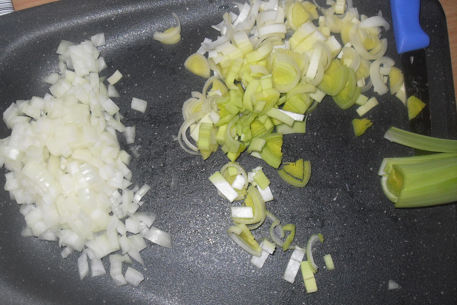 Zubereitung:Die Zwiebel schälen und fein würfeln. Den Lauch putzen und in dünne Ringe schneiden.
