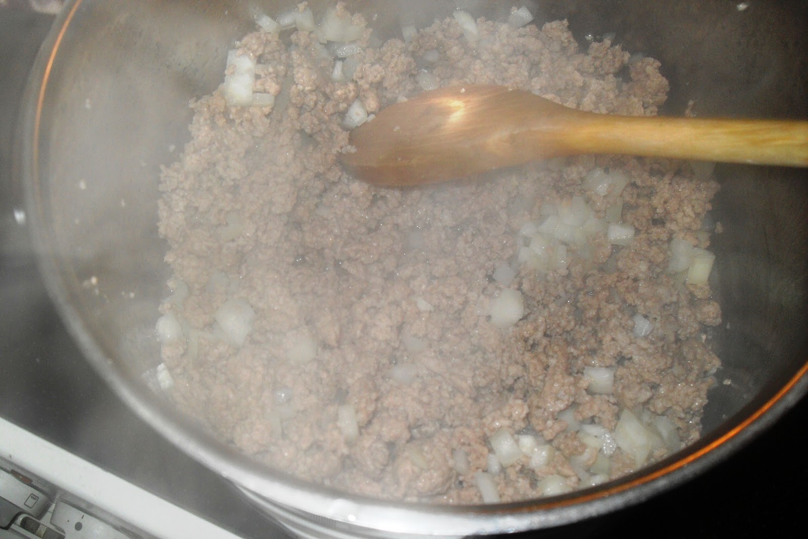 Das Gehacktes mit etwas Öl in einem Topf krümelig braten. Die Zwiebel kurz mit andünsten.