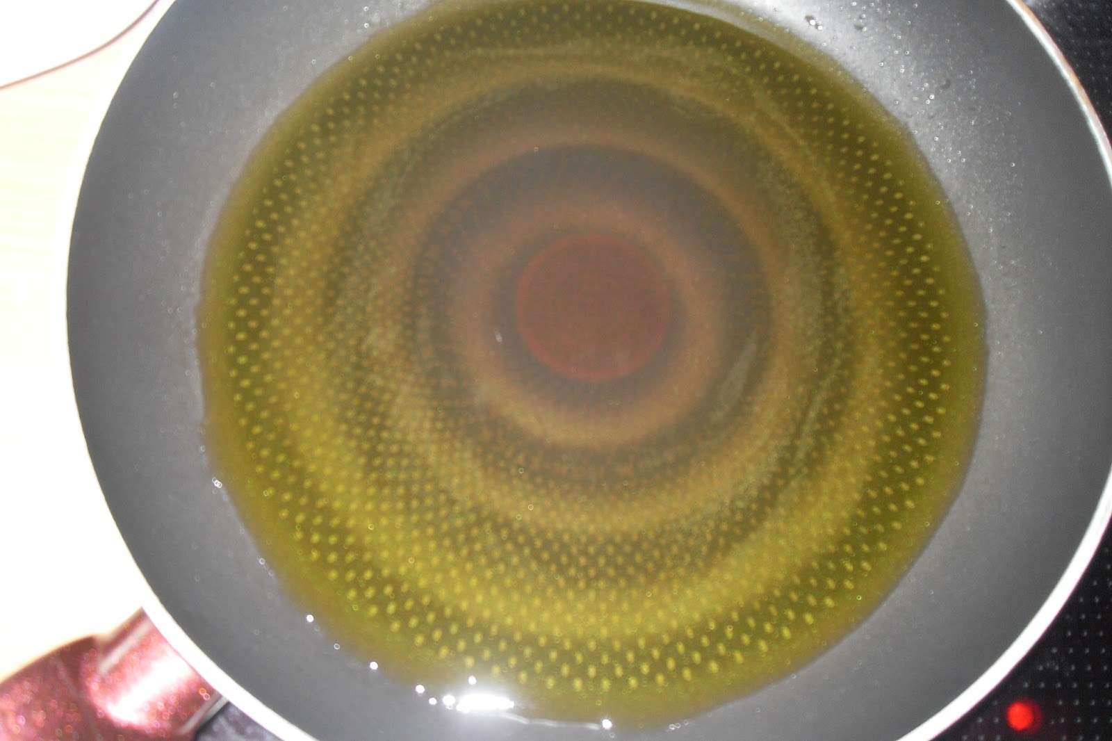 Zwiebel ebenfalls schälen und in kleine Würfelchen schneiden.Eine halbe Tasse Olivenöl in einer weiten Pfanne erhitzen (man sollte darauf achten, das man eine Pfanne nimmt, wo man später einen Teller auflegen kann). Das Fett darf nicht rauchen!