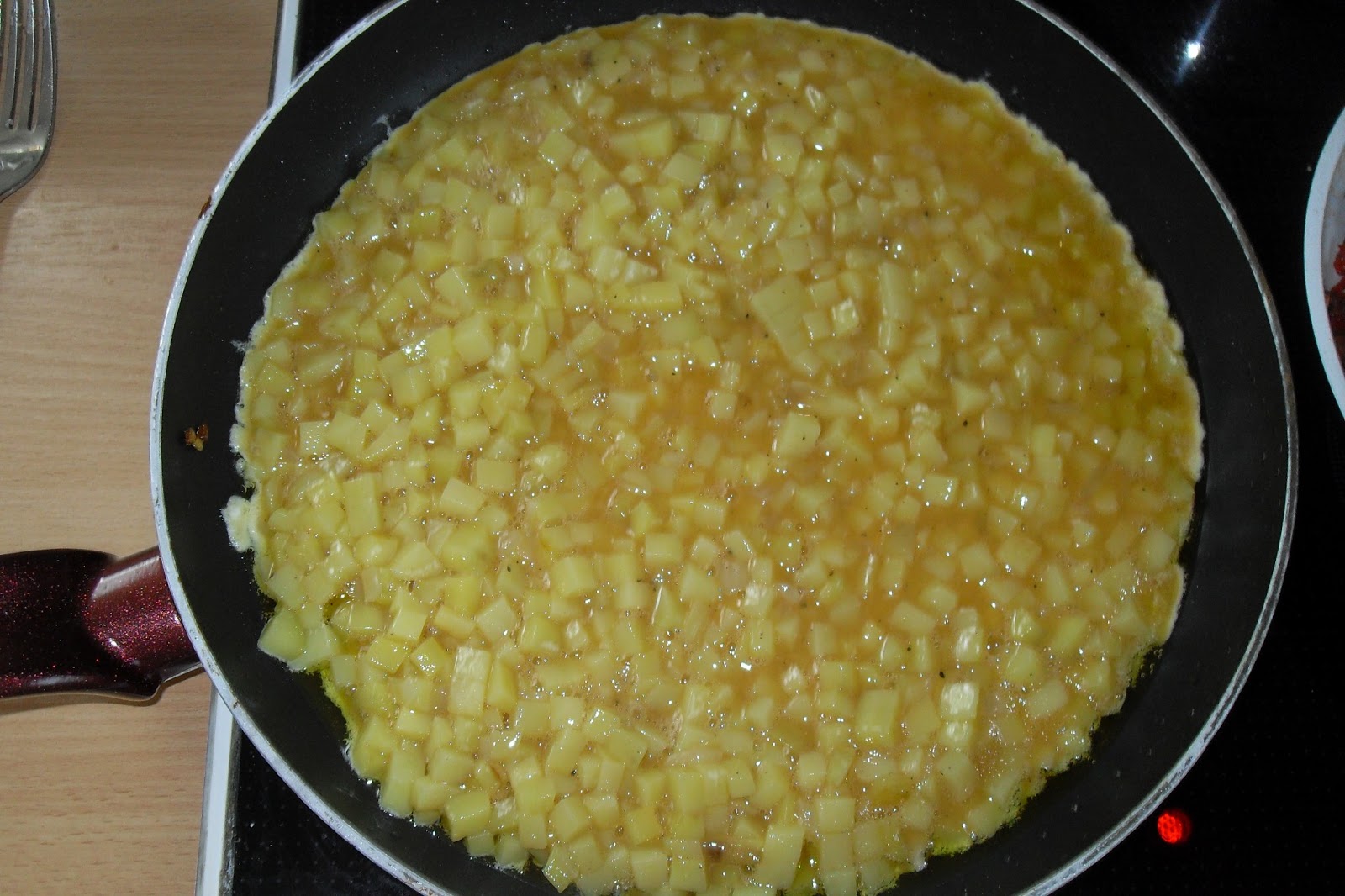Die Pfanne umgedreht auf die Tortilla legen und schnell, zusammen mit dem Teller (ACHTUNG: sehr heiß und man muss schnell sein, damit das Omelett nicht zerfällt) umdrehen, so das die Oberseite im Pfannenboden landet.Die Unterseite ebenfalls stocken lassen, dann auf einen Teller oder großes Brettchen gleiten und auskühlen lassen.