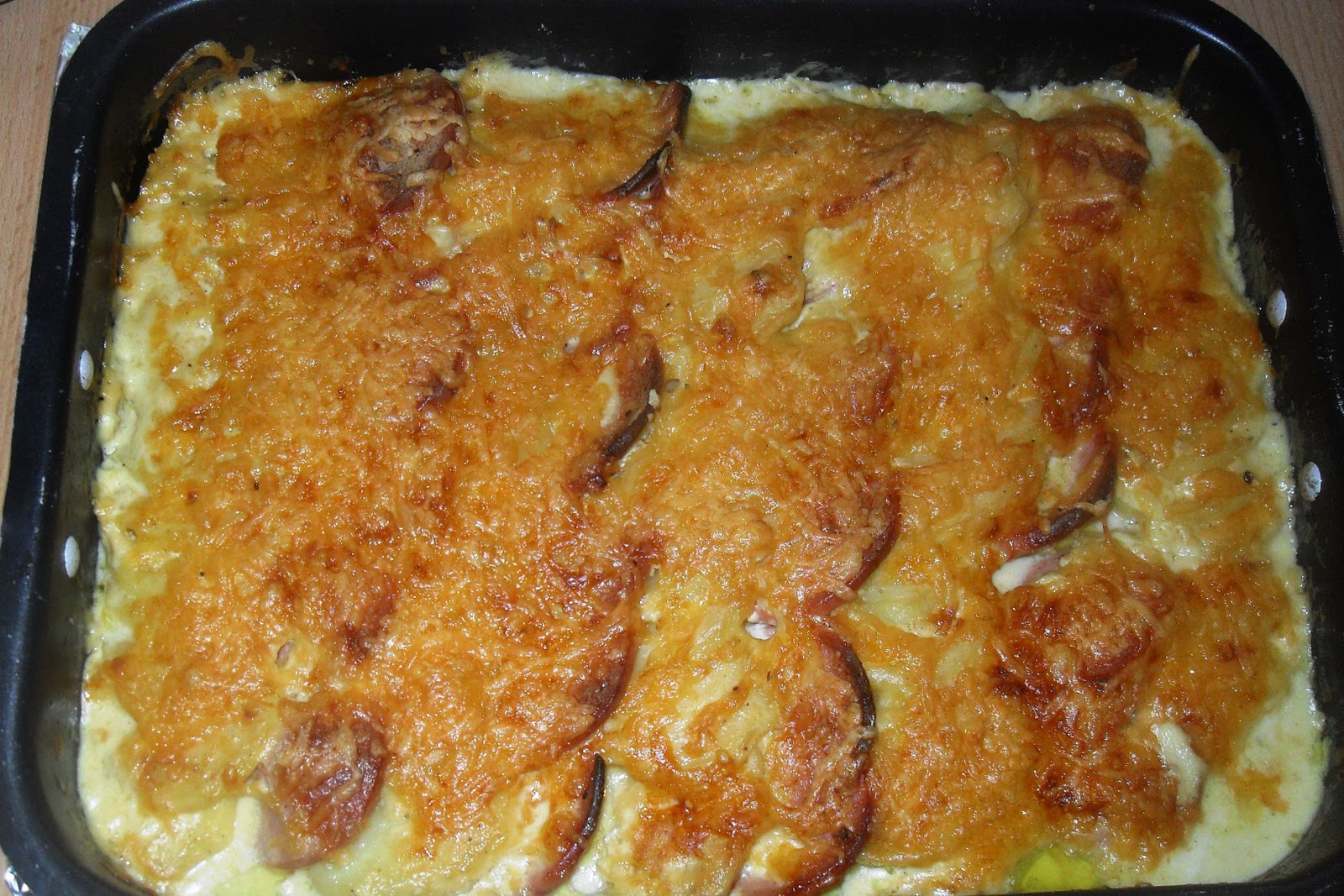 Zutaten:1 kg mittelgroße Kartoffeln 300-350 g Fleischwurst am Stück1 Zwiebel1 Knoblauchzehe 250 ml Milch125 g Schmand 125 g Sahne1,5 EL Senf (nach Geschmack: mittelscharf, scharf oder auch körniger)Salz, frisch gemahlener schwarzer Pfeffer, Muskatnuss (gerieben)100 g geriebenen Käse (z.B. Gouda)1 TL ÖlZubereitung:Die Kartoffeln schälen, waschen und in dickere Scheiben schneiden. Die Fleischwurst von der Haut befreien und ebenfalls in Scheiben schneiden.