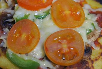 Die Puffer mit Tomatensauce bestreichen, mit Käse (-ersatz) bestreuen und mit Champignons, Paprika, Tomaten in Scheiben etc. belegen. Bei 200 Grad, ca. 10 Minuten überbacken.