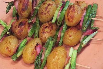 Nun die Zutaten abwechselnd aufspießen – Spargel, Dörrfleisch, Spargel, Kartoffel…