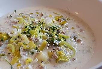 Öl in einen großen Topf geben. Das Hackfleisch darin von allen Seiten gut anbraten und mit Salz und Pfeffer würzen. Den Lauch in kleine Ringe schneiden und zum Hackfleisch geben. Ca. 5 Minuten mit anbraten. Das Wasser zugießen, Brühwürfel hineingeben und alles ca. 10 Minuten auf kleiner Flamme köcheln lassen. Den Schmelzkäse einrühren und schmelzen lassen. Crème fraîche einrühren und noch einmal kurz aufkochen lassen. Die Suppe mit Salz, Pfeffer, Muskat, Knoblauch und Zwiebelpulver kräftig abschmecken.
