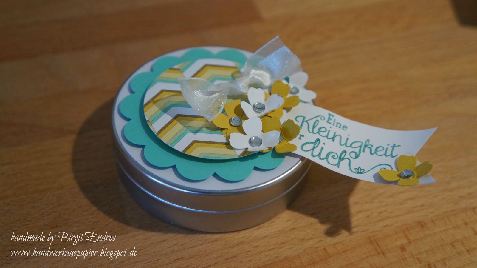 Meine Gäste hatten auch Gelegenheit einige Kleinigkeit selbst zu werkeln. Vorbereitet hatte ich diese runde Metalldose mit neuem Designerpapier, neuem Stempel und der neuen "Itty Bitty"-Blümchenstanze..........