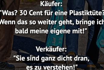 Auf Facebook teilen Vorige Folgende Käufer: "Was? 30 Cent für eine Plastiktüte?... Autor des Artikels : istdaslustig Zum Original-Artikel Käufer: "Was? 30 Cent für eine Plastiktüte? Wenn das so weiter geht, bringe ich bald meine eigene mit!" Verkäufer: "Sie sind ganz dicht dran, es zu verstehen!" Hier geht es zum Artikel Mehr Lustiges auf www.istdaslustig.de Auf Facebook teilen Vorige Folgende Das könnte Ihnen gefallen Mehr