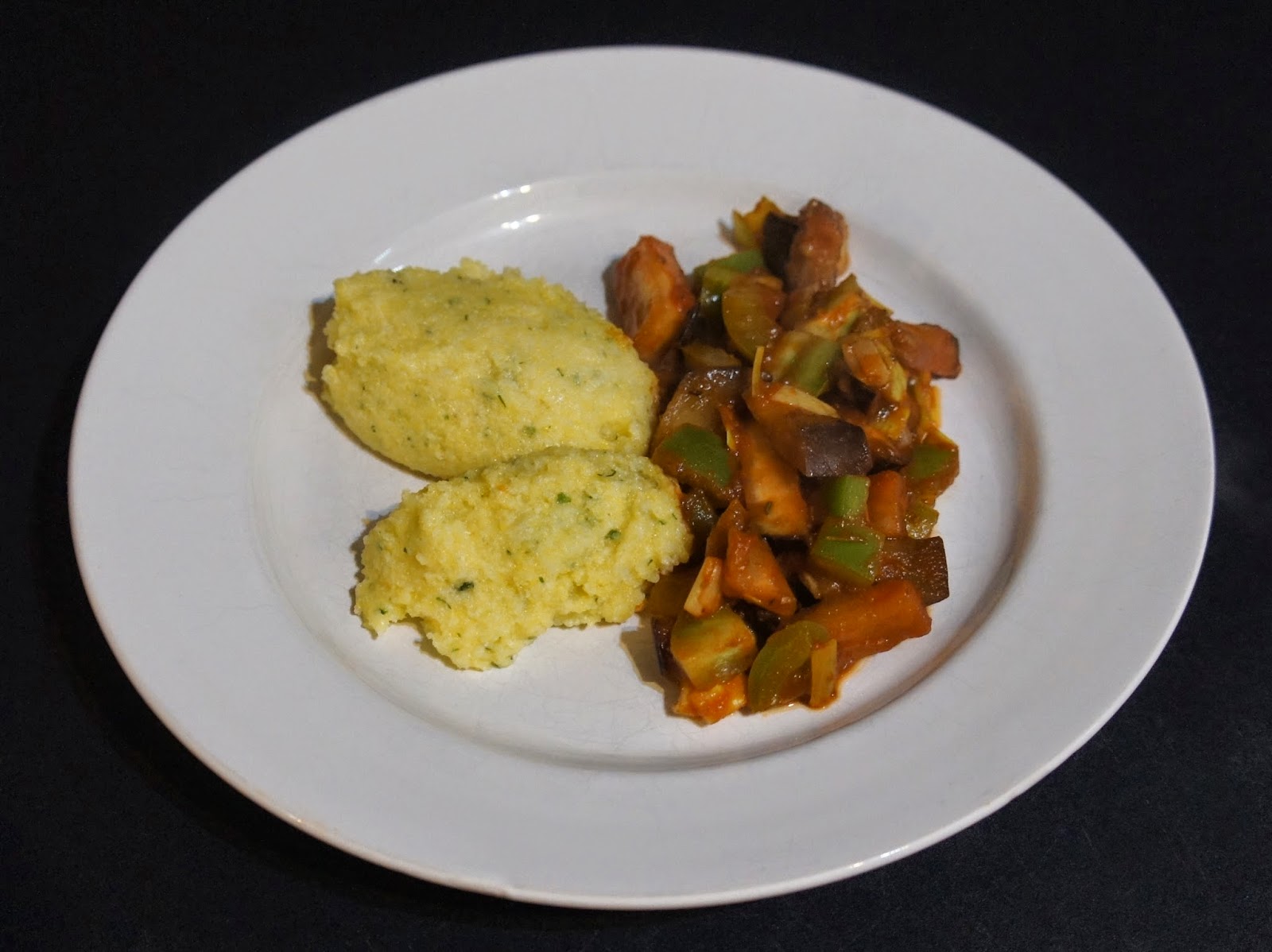 Gemüsefond aufkochen und die Polenta einrühren, von der Flamme nehmen und quellen lassen. Nebenbei die Aubergine, Paprika und Lauch in Stücke schneiden. In einer Pfanne mit etwas Öl anbraten. Mit den passierten Tomaten ablöschen und mit Oregano, Salz und Pfeffer abschmecken.