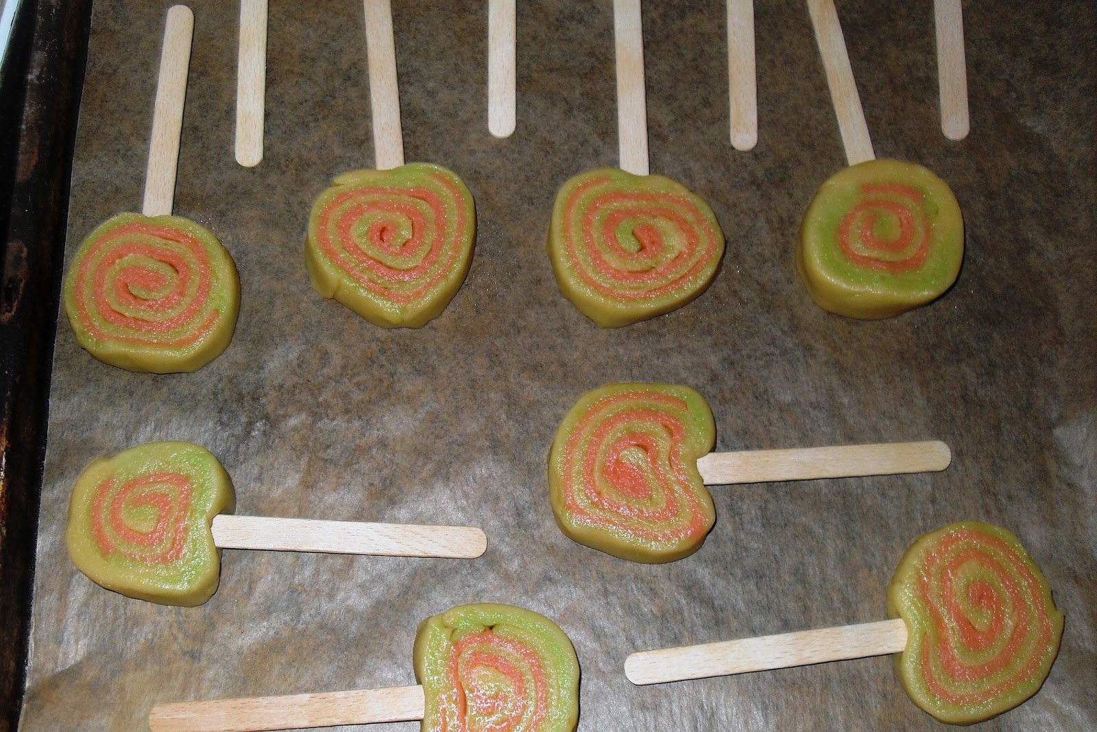 Zubereitung: Alle oberen Teigzutaten in eine Schüssel geben und schnell zu einem Mürbeteig verkneten. Sollte der Teig zu trocken sein (kommt immer auf die Mehlsorte an), einfach ein paar Tropfen kaltes Wasser dazugeben.Wer bunten Teig möchte (ich habe mich für spiralförmige bunte Lollies entschieden und 3 Farben gewählt), teilt den Teig entsprechend auf und färbt ihn mit einigen Tropfen Speisefarbe bis zur gewünschten Intensität.