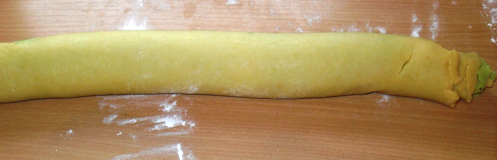 Ich wollte ja spiralförmige Lollies machen und habe hierfür zunächst alle 3 Teigfarben einzeln ausgerollt (so dünn, das sie kurz vor dem zerreißen sein.