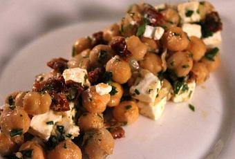Kichererbsen in einem Sieb abtropfen lassen und gut abspülen. In einer Schüssel die Kichererbsen, Zwiebel, getrocknete klein geschnittenen Tomaten, den gewürfelten Feta und die gehackte Petersilie vermischen. Etwas Schale der Bio-Zitrone dazu reiben. Anschließend Zitrone aufschneiden und auspressen.