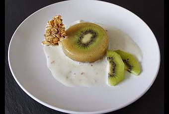 In einem Topf erhitzen, die Agartine (entsprechend der Püreemenge) dazugeben und aufkochen lassen. Je eine Scheibe Kiwi in ein Förmchen geben (ich verwende hier 100ml fassende Silikonformen) und danach mit dem Püree auffüllen und zum Gelieren kaltstellen.