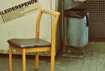 Da muss ein Missverständnis vorliegen. Stühle kann man zwar beziehen, aber definitiv nicht anziehen. In die Kleiderspende gehört ein Stuhl folglich nicht. Oder ist das ein dezenter „Wir warten!"-Hinweis, der die Spendenbereitschaft erhöhen soll? Zu einer unerfreulich langen Wartezeit passt auch die Invasion der Zigarettenstummel.
