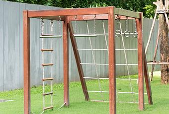 Massivholz ist ideal für die Anfertigung eines Klettergerüsts. Das Naturmaterial ist robust. Holz wird im Sommer nicht zu heiß und im Winter fühlt es sich nicht zu kalt an. Damit es nicht splittert, muss es vor dem Bauen abgeschliffen werden. Kiefer beispielsweise ist eine Holzart mit einem hervorragenden Preis-Leistungsverhältnis. Kiefernholz wird seit Jahrhunderten wegen der natürlichen Eigenschaften geschätzt. Deshalb ist es auch die am häufigsten verwendete Holzart in Europa. Durch eine umweltfreundliche, Chemie-freie Imprägnierung erhöht sich die Haltbarkeit. Verwenden Sie am besten rostfreie Schrauben aus Edelstahl zum Zusammenbauen. Alle Zubehörteile sollten unbedingt sicherheitsgeprüft sein. Mithilfe von geprüften Schaukelsitzen und Kletterseilen verwandeln Sie das Klettergerüst in ein Spielgerät, auf dem Ihre Kinder nicht nur Spaß am Schwingen haben, sondern auch sicher sind.