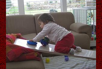 Das Highlight war jedoch die Rampe aus einem Regalbrett, das wir einfach an einem Ende auf die Couch gelegt haben. Schon ging es rauf und rückwärts wieder runter. Zwischendurch wurde auch mal gerutscht. Da es nicht steil genug sein konnte haben wir noch zwei Kissen darunter gelegt. Dadurch wurde es auch noch instabiler und das Gleichgewicht war noch mehr gefordert.Alternativ dazu kann dafür auch eine Matratze genommen werden. Der Fantasie ist hier keine Grenzen gesetzt. Zur Absicherung einfach Decken drunterlegen und schon kann es los gehen.