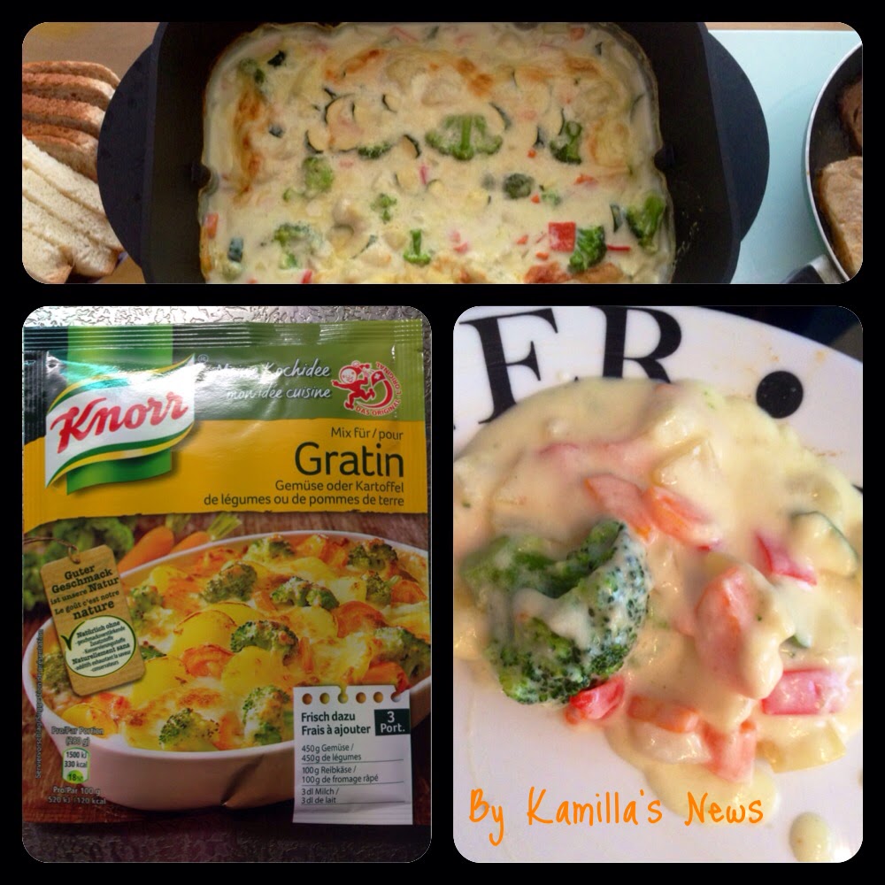 Das Gemüse Gratin: Die Sauce war ein bisschen Fad ansonsten Top. Man kann das Gemüse nach belieben beifügen. Schnell und einfach zubereitet. Dazu gab es Reis und Fleisch.