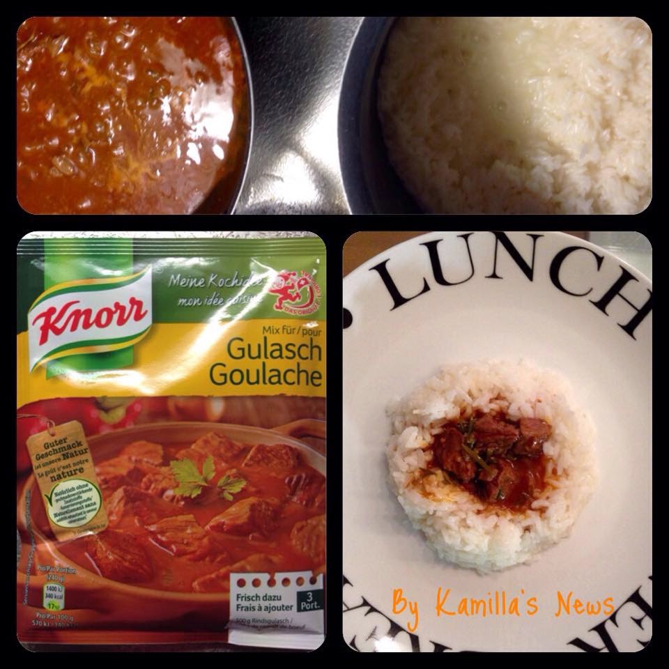 Das Gulasch: Es hat uns leider nicht geschmeckt. Das Fleisch war zäh und die Sauce hatte keinen Geschmack.Das Rezept ist einfach zuzubereiten. Aber braucht gleich lange wie wenn man das selber Kocht. Dazu gab es Reis.