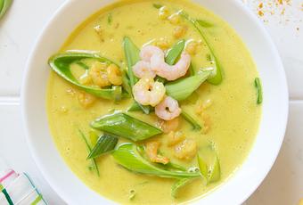 Öl in einen Topf geben und die kleingeschnittenen Frühlingszwiebeln mit dem Knoblauch und der Chilischote kurz anbraten. Garnelen dazugeben und mit einem kleinen Schuss Kokosmilch ablöschen. Nun nach und nach mit Kokosmilch auffüllen und langsam köcheln lassen. Curry dazugeben. Kurz vor Schluss den restlichen Teil (das grüne) der Frühlingszwiebel dazu geben. Mit Salz & Pfeffer abschmecken. Kokossuppe in Schälchen geben und servieren.