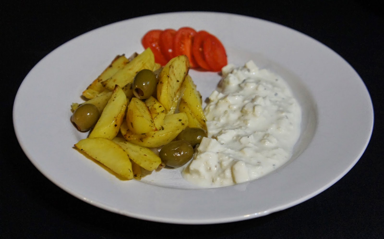 Zwiebeln schälen und ebenfalls in Spalten schneiden.Danach Kartoffeln, Zwiebeln und Oliven mit dem Öl (hier geht's zum Rezept) marinieren. Alles auf einem mit Backpapier belegten Backblech auslegen und im vorgeheizten Backofen bei 200Grad ca. 25 Minuten garen (abhängig von der Spaltengröße).Für die Creme (optional)