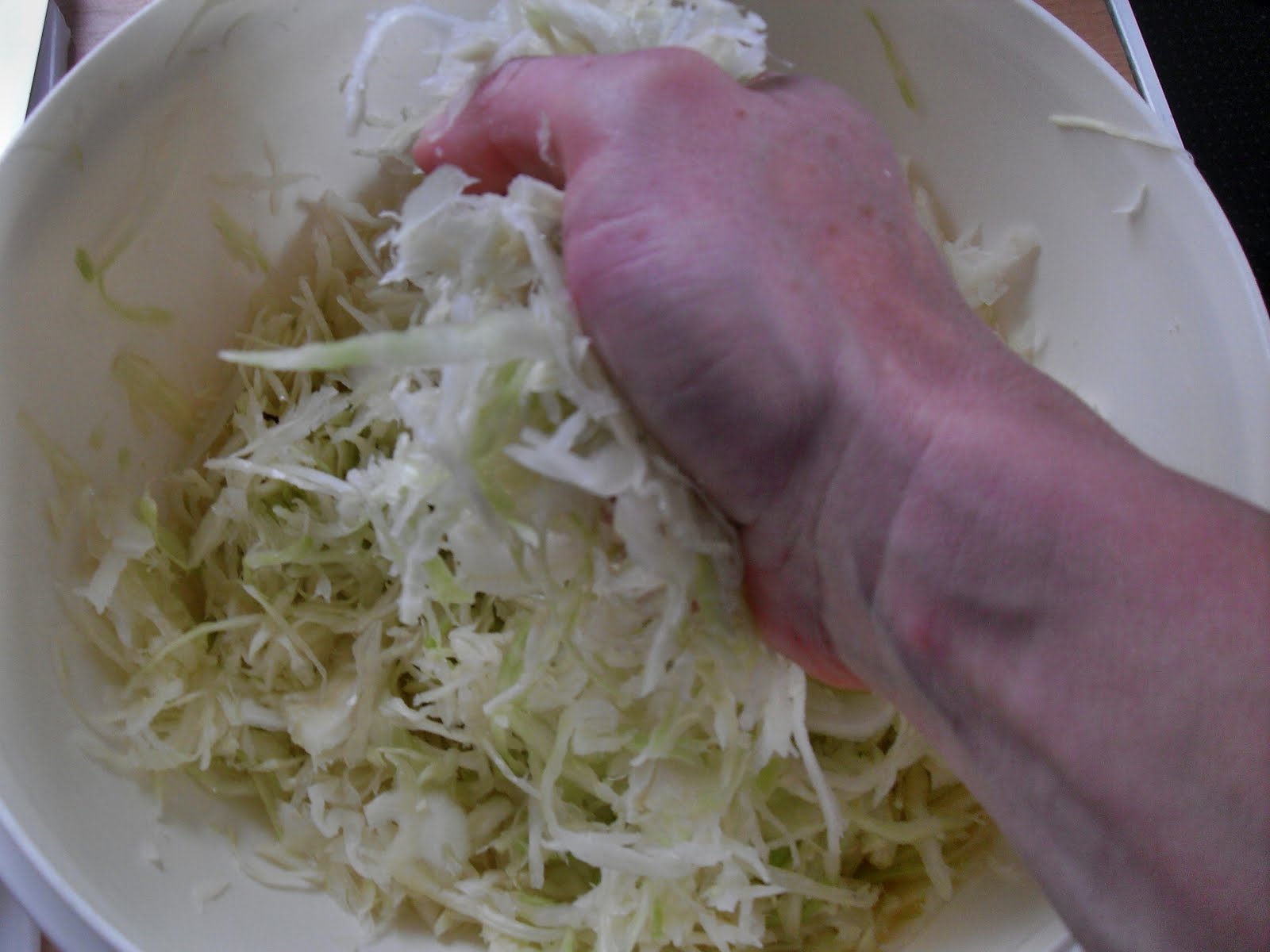 Einen gestrichenen TL Salz über den Kohl geben und mit den Händen gut durchkneten. Das sorgt dafür das der Salat etwas mürber wird und das die Marinade besser aufgenommen werden kann.