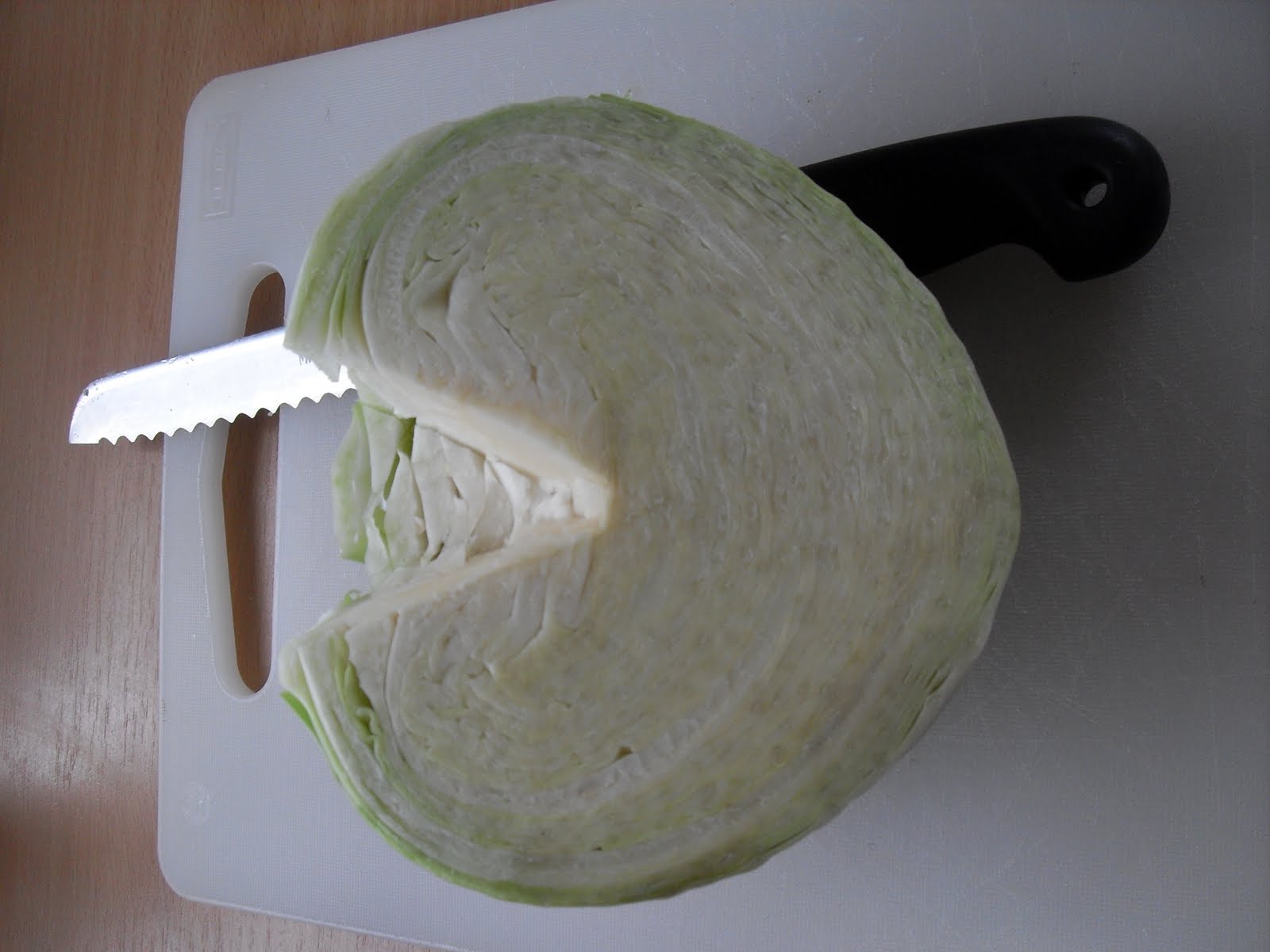 Zutaten:1 kg Weißkohl1 gestrichener TL Salz1 kleine Paprika4 EL weißer Balsamico Essig8 EL Wasserschwarzer (frisch gemahlener) Pfeffer3 TL Zucker1 TL ÖlZubereitung:Den Weißkohl putzen (Strunk abschneiden und die äußeren 4-5 Blätter entfernen) und in Stücke schneiden.Den Strunk keilförmig herausschneiden.