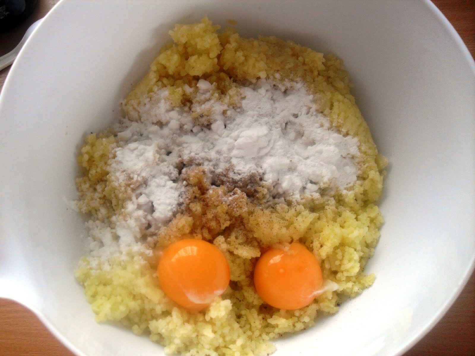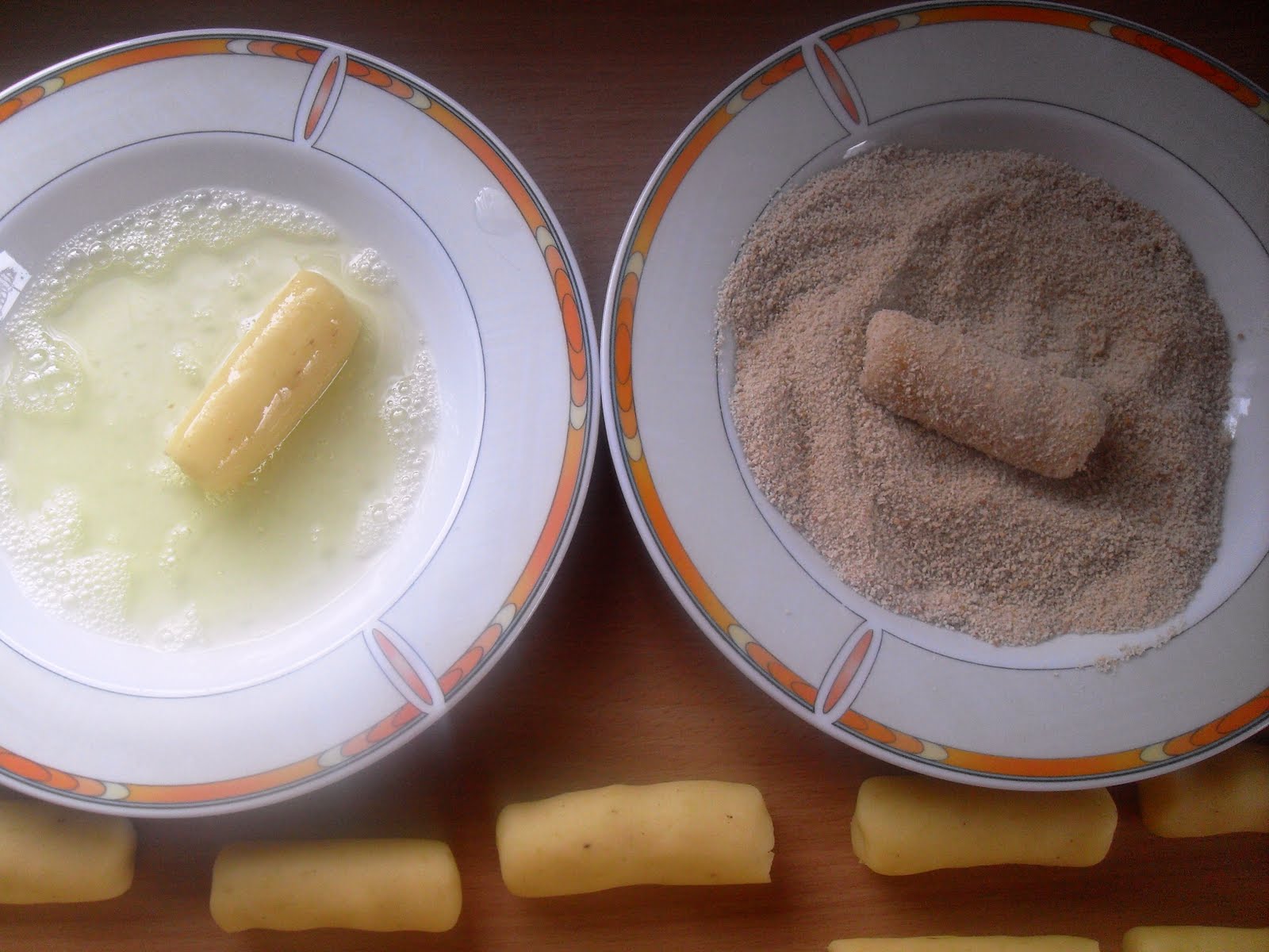 Zutaten:600 g Kartoffeln2 Eier (Gr. M)Salz, weißer Pfeffer (fein gemahlen)Muskat (gemahlen)25 g Kartoffelmehl (oder Speisestärke)20 g flüssige MargarinePaniermehlÖl zum AusbackenZubereitung:Die Kartoffeln in Salzwasser ca. 20-30 Minuten (je nach Größe) und mit kaltem Wasser abschrecken. Sofort pellen.Dann sofort durch eine Kartoffelpresse drücken und auskühlen lassen.Die Eier trennen, das Eiweiß in einen Suppenteller und das Eigelb zu den Kartoffeln geben. Die Kartoffeln mit Salz, Pfeffer und Muskat würzen und das Kartoffelmehl und die Margarine hinzufügen.Alles gut verkneten und abschmecken. Falls nötig, noch mal nachwürzen. Der Teig sollte nicht kleben und sich gut formen lassen.Nun Rollen formen (daumendick) und in Stücke schneiden (5-7 cm lang nach Geschmack). Die Enden abrunden.Ich habe aus der Menge 21 Stück herausbekommen.Jetzt die Röllchen erst in (verquirltem) Eiweiß, dann vorsichtig in Paniermehl wälzen.Um sicher zu gehen, das der Geschmack stimmt und der Teig nicht zu weich ist (dann können die Kroketten aufplatzen beim Ausbacken), habe ich einen kleinen Topf mit Öl erhitzt und eine Probekrokette frittiert:Das Ergebnis war super! Außen schön knusprig und innen schön weich und lecker!Nun noch den Rest paniert und bis abends in den Kühlschrank gestellt.Fritteuse auf 180 Grad erhitzen und die Kroketten bis zur gewünschten Bräune ausbacken.Anmerkungen:- ein einfaches und recht schnelles Rezept - die meiste Zeit geht für das Formen drauf :-)- kein Vergleich zu TK-Kroketten- lassen sich gut vorbereiten ohne durchzuweichen- man kann sie wohl auch einfrieren und tiefgekühlt frittieren. Habe ich aber noch nicht ausprobiert, da ich eh immer zu wenig Platz in der Tiefkühlung habe :-)