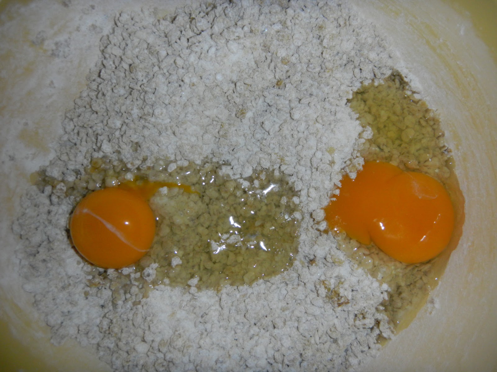 Das Mehl mit dem Backpulver und der Speisestärke mischen, dann über die Haferflocken sieben und leicht unterheben. Dann das Salz, die Orangenschale, Zimt und Vanille, Zucker und Vanillezucker dazugeben und ebenfalls unterheben. Die Eier dazugeben.