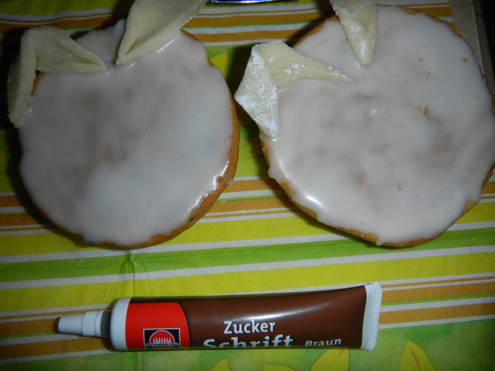 7.Wenn der Guss getrocknet ist, kann mit brauner Zuckerschrift ein Gesicht aufgemalt werden.