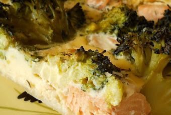 Den Brokkoli in kleine Röschen teilen (den Strunk dabei nicht verwenden), waschen,in etwas Salzwasser bissfest garen und gut abtropfen lassen.Den Blätterteig mit dem Papier in eine feuerfeste Form ausrollen und mehrmals mit der Gabel einstechen,Brokkoli und Lachs darauf verteilen,Eier, Sahne, Milch und Gewürze miteinander verquirlen und darüber gießen,im vorgeheiztem Backofen bei 200° ca. 30 Minuten backen.