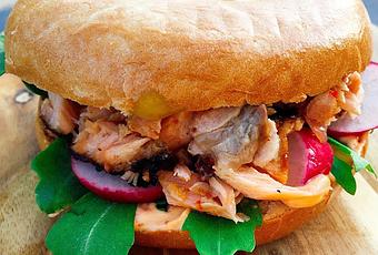 Zubereitung:Den Lachs in etwas Öl bei mittlerer Hitze von beiden Seiten gar braten, salzen und pfeffern, und anschließend mit 2 Gabeln zerrupfen. Bagels in der Zwischenzeit aufbacken/toasten. Die Unterseite mit Frischkäse, die Oberseite mit Honig-Senf bestreichen. Unterseite mit Rucola und Radieschenscheiben belegen, 1/4 des Lachses daraufverteilen und den Bagel zuklappen. Frisch und pikant im Geschmack. Guten Appetit!