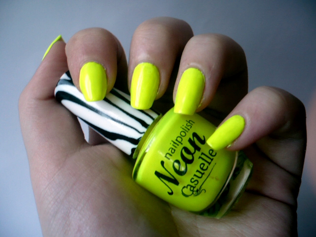 Hallo ihr Süßen,gleich mal zu Anfang: Es ist super schwer, ein Neongelb einzufangen und auch wenn ich jetzt halbwegs zufrieden bin, müsst ihr euch diesen Neoneffekt noch ne Runde stärker vorstellen, denn das ist einfach der krasseste Neonlack, den ich je gesehen habe, aber erst einmal wieder die kleine wochentliche Erklärung, worum es bei dieser Aktion "Lacke in Farbe ... und bunt!" geht.Lena und Cyw haben diese kleine Aktion ins Leben gerufen und jeden Mittwoch gibt es eine Farbe, die lackiert wird und diese Woche ist es, wie nicht anders zu erwarten, die Farbe gelb und wenn ich Gelb bei Nagellacken höre, denke ich sofort an Neon. Natürlich habe ich auch normale Gelbtöne in meiner Nagellacksammlung, aber die meisten wurden gestern schon lackiert und ... tja, ich liebe Neon!Eigentlich hätte ich ja gestern nach Gelb lackieren müssen, aber ich konnte mich gestern einfach noch nicht von meinem letzten Nageldesign trennen und auch heute war es noch eine Qual, doch die Tatsache, dass ich mir gestern beim Autofahren den einen Nagel angehauen habe und in dem Design ein paar Risse entstanden sind, machte es doch ein wenig einfacher, das Design zu entfernen und mit diesem tollen Neonlack zu ersetzen.Diese drei Bilder sind bei Tageslicht geschossen und jaaaaa ... das letzte Bild ist überbelichtet, aber sonst war der krasse Neoneffekt einfach nicht rauszuholen. :)Gefunden habe ich diesen Lack bei einem Douglas in Groningen und es war der einzige Lack dieser Marke. Im Internet habe ich noch ein paar andere Neonlacke dieser Marke gefunden, die ich mir irgendwann auf jeden Fall noch zulegen muss, weil die einfach der Hammer sind. Als ich im Douglas stand und diesen Lack fand, habe ich quer durch den Laden nach meiner Mutter gebrüllt, was mir einige verwunderte Blicke der Holländer eingebracht hat, aber ich war so geflasht von diesem Lack, dass mir das vollkommen egal war, als ich durch den Laden zu meiner Mutter hüpfte. :)Ich habe den Lack auf einer weißen Base in zwei Schichten lackiert und wie ihr sehen könnt ist der Lack unter der Lampe einfach nicht schön einzufangen. Er sieht einfach viel gelber und weniger Neon aus, weshalb ich die Bilder mit Tageslicht viel besser finde. :) Ich liebe diesen Lack einfach und kann nicht aufhören, auf meine Nägel zu starren, weil der Lack doch wirklich sehr flasht. :)Und jetzt weiß ich auch, warum ich diese Aktion so gerne mitmache, weil sie mich Lacke wieder rauskramen lässt, die ich irgendwie schon ein bisschen vergessen habe. Natürlich habe ich diesen Lack immer geliebt, aber irgendwie nur ein Mal lackiert. :) Das war das zweite Mal und ich bin mir sicher, dass es sich gelohnt hat, von haufenweise Holländern angestarrt zu werden. :)Und nächste Woche ist dann die Farbe Türkis an der Reihe.So, wie findet ihr den Lack?Und wie gefallen euch generell Neonlacke?