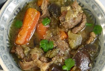 Temperatur erhöhen und das Fleisch in den Topf geben. Kurz unter Rühren anbraten, dann den Alkohol angießen. Rühren, dabei den Bratensatz vom Boden lösen. Karotten und Auberginen zugeben, ca. 175 ml heißes Wasser angießen und Salz und Sternanis zugeben. Alles zum Kochen bringen, dann den Deckel auflegen und den Topf in den heißen Ofen geben. Den Knoblauch in der Form ebenfalls dazugeben.