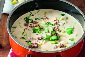 Brühe angießen und alles aufkochen. Crème fraîche, Frisch- und Schmelzkäse unterrühren. Suppe bei schwacher Hitze 5–10 Minuten köcheln lassen.