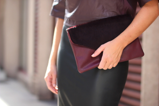 Was trägt man bei einem Event mit dem Dresscode "trendy leather"? Lederröhre & Lederjacke? Nein, zu einfach. Lederkleid? Nein, zu oft gesehen. Lederjogger & Blazer? Nein, zu oft getragen. Lederrock und Top? Hm, könnte passen! Zumindest, wenn es ein in Form & Farbe spezielles Outfit ist. Wenn es sowohl elegant, als auch lässig ist! So habe ich mich letzte Woche Samstag Abend für diesen Look entschieden: Ein enger Maxirock aus Leder kombiniert mit einem coolen Kunstledertop (natürlich in trendy Marsala :-) ...) in Blousonschnitt. Dazu noch extravagante high heels aus Berlin und eine farblich passende Clutch - fertig war mein Look für einen wirklich tollen Abend. Und zugleich der dritte Look meiner "Marsala collection" für diese Woche ... - Was sagt ihr zu meiner Interpretation des Dresscodes? Und welcher Marsala-Look diese Woche gefällt Euch am besten?Evening look with maxi skirt & top.