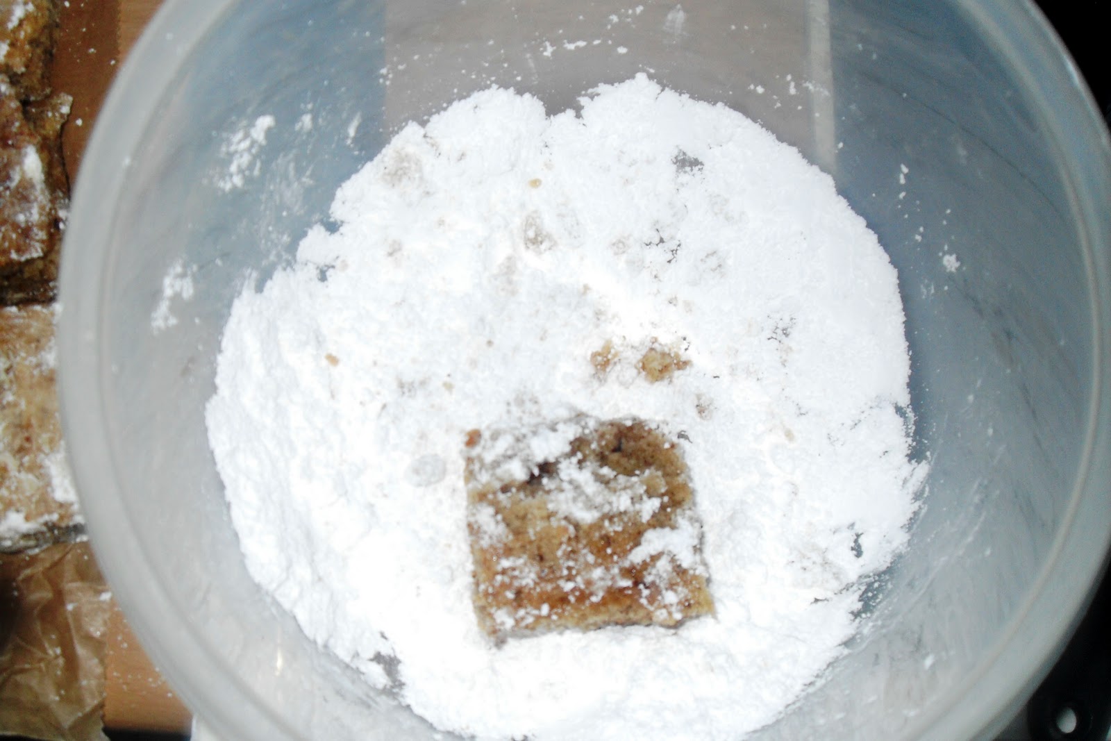 Zutaten:500 g Butter (geschmolzen)8 Eier4 Tassen Zucker2 Tassen Mehl2 Päckchen Vanillezucker3 Tassen geriebene Haselnüsse1 Tasse Rosinen2 EL Rum1-2 TL Zimt1 Beutel (10 g) Lebkuchengewürz100 g PuderzuckerZubereitung:Backofen auf 175 Grad (Ober-/Unterhitze) vorheizen und ein Backblech mit Backpapier auslegen.Butter, Eier und Zucker schaumig aufschlagen.