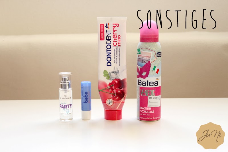 Essence Parfum "like the party of my life": mochte den Duft sehr gerne, war aber limitiert, daher: wird nicht neu angeschafftbebe Labello: unverzichtbar, mein ständiger Begleiter. Wird immer wieder neu angeschafft. Dontodent Zahncreme "Cherry Mint": mochte den Geschmack nicht sehr, viel zu süß. Wird nicht neu angeschafft. Balea Rasierschaum "Venedig": war leider eine LE, mochte ich super gerne, toller Duft. Wird nicht neu angeschafft, da limitiert.
