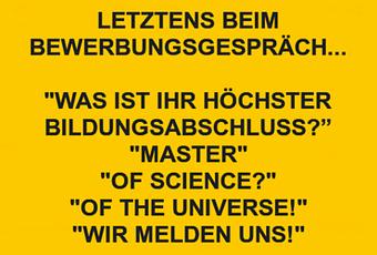 Auf Facebook teilen Vorige Folgende LETZTENS BEIM BEWERBUNGSGESPRÄCH... "WAS IST... Autor des Artikels : istdaslustig Zum Original-Artikel LETZTENS BEIM BEWERBUNGSGESPRÄCH... "WAS IST IHR HÖCHSTER BILDUNGSABSCHLUSS?” "MASTER" "OF SCIENCE?" "OF THE UNIVERSE!" "WIR MELDEN UNS!" Hier geht es zum Artikel Mehr Lustiges auf www.istdaslustig.de Auf Facebook teilen Vorige Folgende Das könnte Ihnen gefallen Mehr