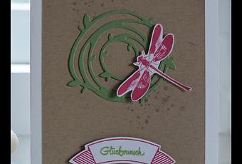 Die nächste Karte mit dem Stempelset "Swirly Bird" und den Thinlits "wunderbar verwickelt". Dieses mal habe ich das Stempelset "Awesomely Artistic" mal wieder rausgeholt - die Libelle ist so wunderschön und ich finde es sehr schön, dass dieses Set im neuen Katalog wieder mit dabei ist! Gestempelt ist das Libellchen in rosenrot. Und die Tupfen im Hintergrund (savanne) gehören auch dazu.