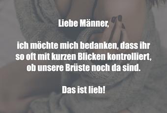 Auf Facebook teilen Vorige Folgende Liebe Männer, ich möchte mich bedanken, dass... Autor des Artikels : istdaslustig Zum Original-Artikel Liebe Männer, ich möchte mich bedanken, dass ihr so oft mit kurzen Blicken kontrolliert, ob unsere Brüste noch da sind. Das ist lieb! Hier geht es zum Artikel Mehr Lustiges auf www.istdaslustig.de Auf Facebook teilen Vorige Folgende Das könnte Ihnen gefallen Mehr