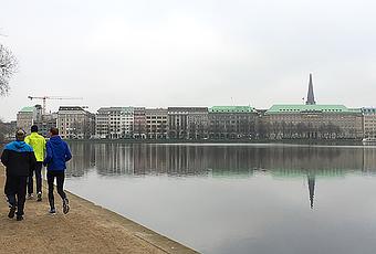 07:30 Uhr: Treffen mit allen Läufern und Radlern im Hotelfoyer. Martin und Sebastian vom Radisson sind natürlich auch schon da und sehen erschreckend trainiert aus in ihren engen Sportklamotten. Kurz überlege ich, ob ich nicht doch das Rad nehmen soll, aber nein, ich möchte mich herausfordern. Zwar laufe ich Zuhause auch sehr gern, aber dann allein, ganz in Ruhe und meist nur so 5-6 Kilometer. Nun soll es einmal um die Alster gehen - knapp 10 Kilometer!