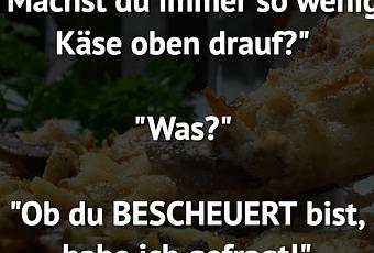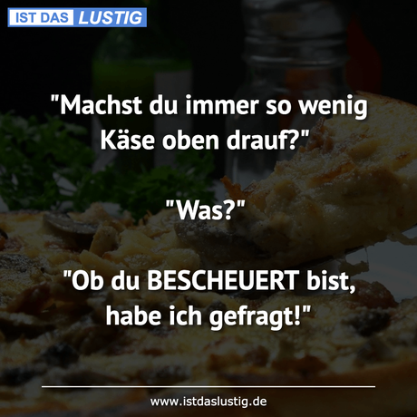 Auf Facebook teilen Vorige Folgende "Machst du immer so wenig Käse oben drauf?"... Autor des Artikels : istdaslustig Zum Original-Artikel "Machst du immer so wenig Käse oben drauf?" "Was?" "Ob du BESCHEUERT bist, habe ich gefragt!" Hier geht es zum Artikel Mehr Lustiges auf www.istdaslustig.de Auf Facebook teilen Vorige Folgende Das könnte Ihnen gefallen Mehr